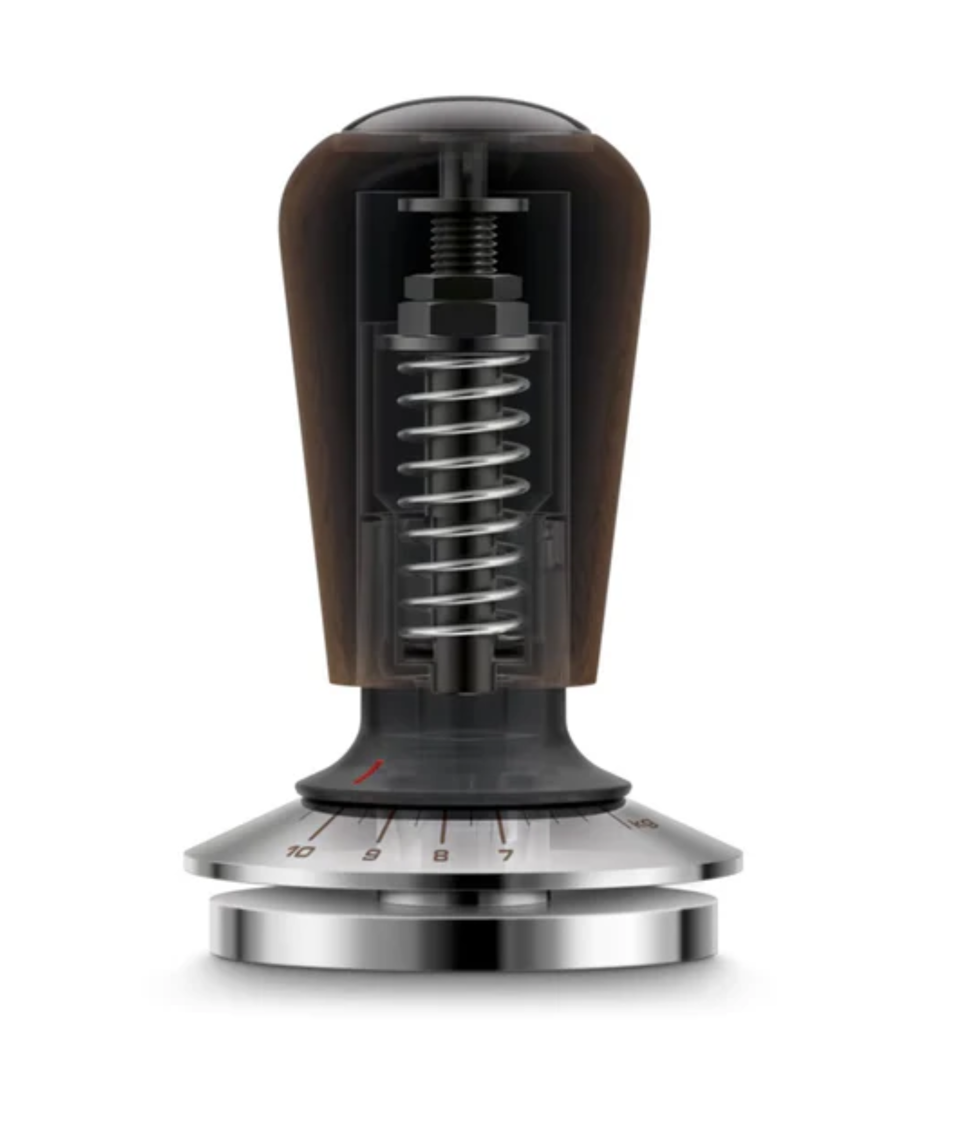 The spring-loaded mechanism provides consistent pressure between 15.4 and 22lb. The variable force gauge has marking indicators to let you select your preferred tamp force to the grind. The leveling plate ensures perfectly level tamping so the grind isn’t unevenly compacted on one side which helps produce a more balanced shot.